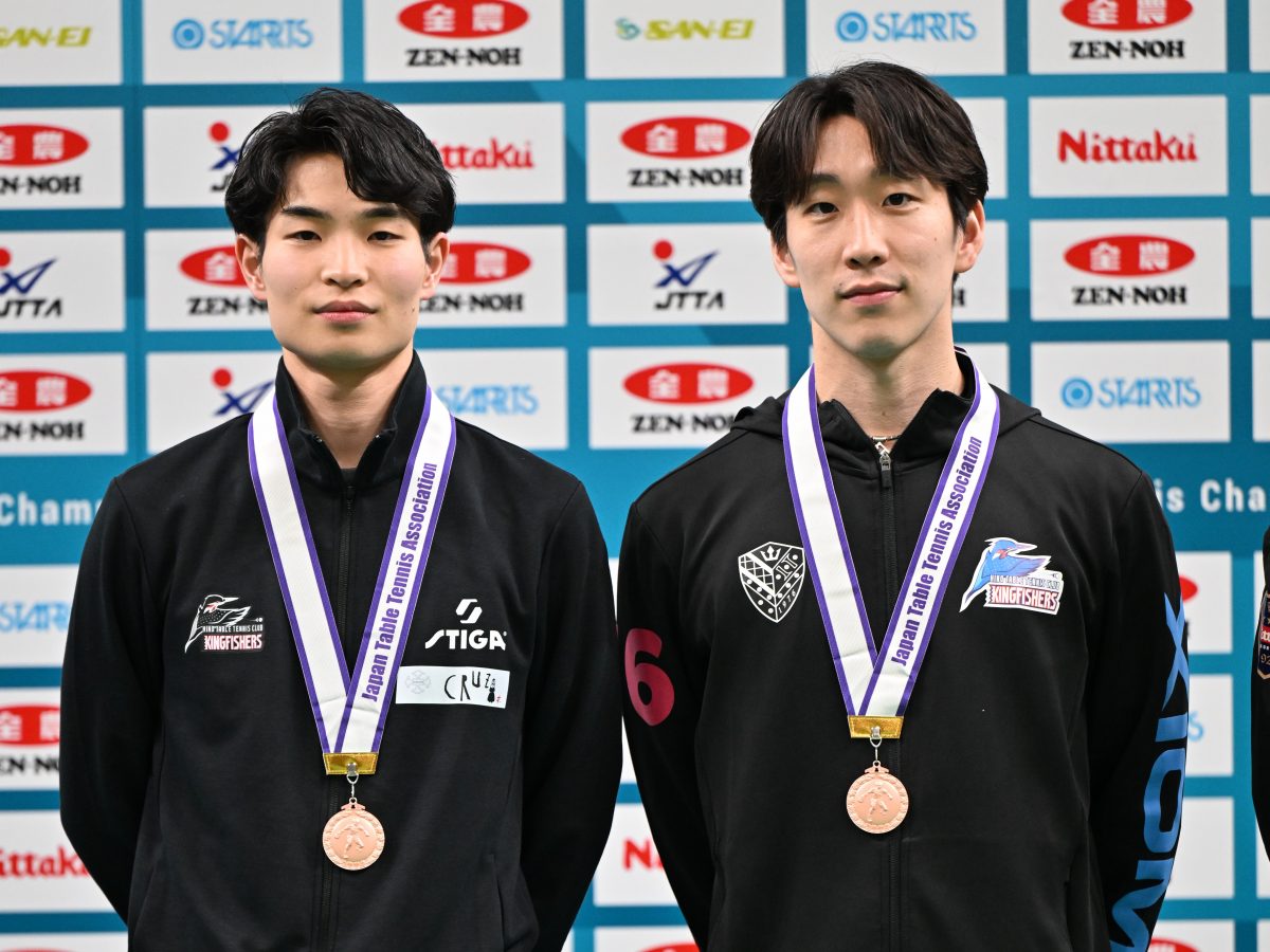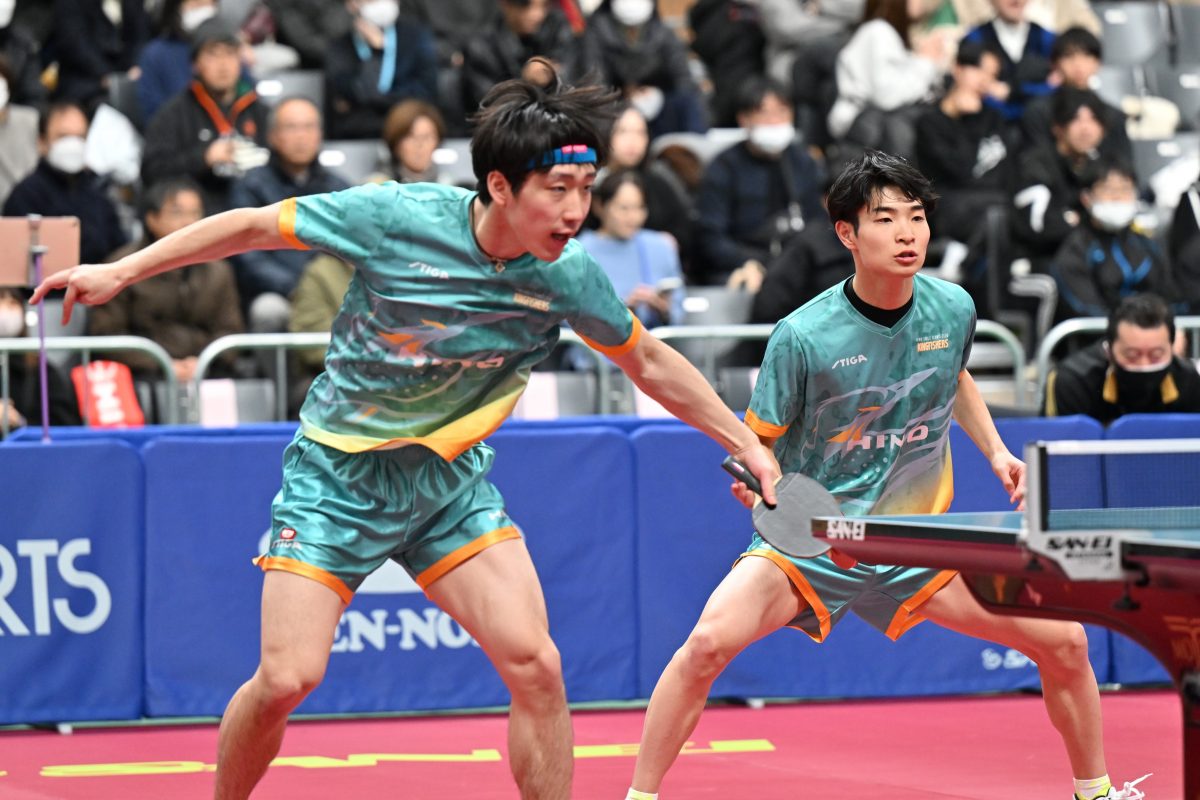 写真:全日本選手権ダブルスで3位に入った静岡学園OBの川上尚也(写真左・日野キングフィッシャーズ ペアは西康洋)/撮影:ラリーズ編集部