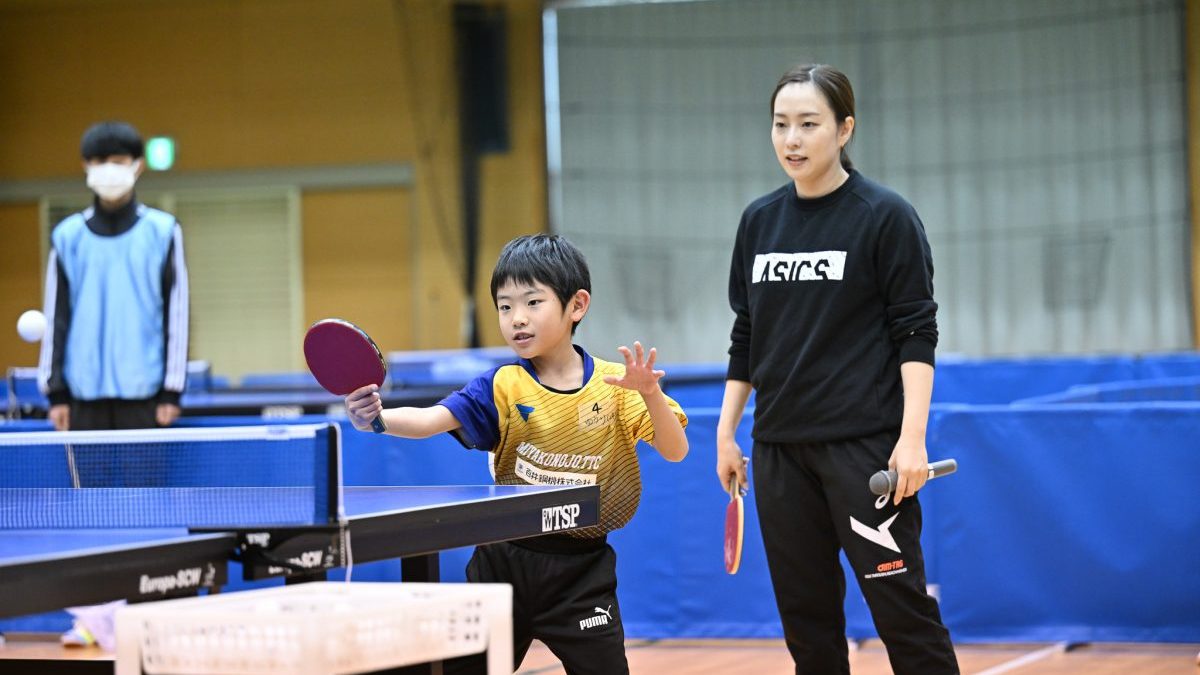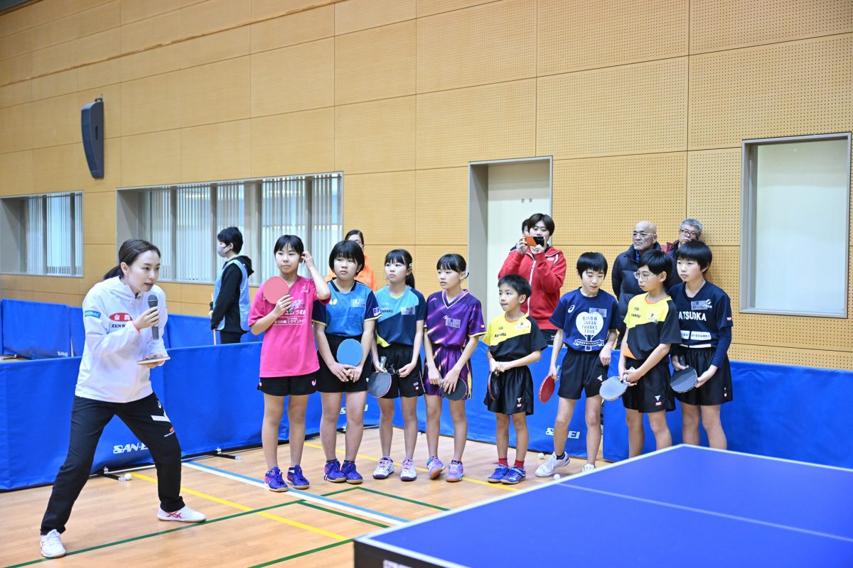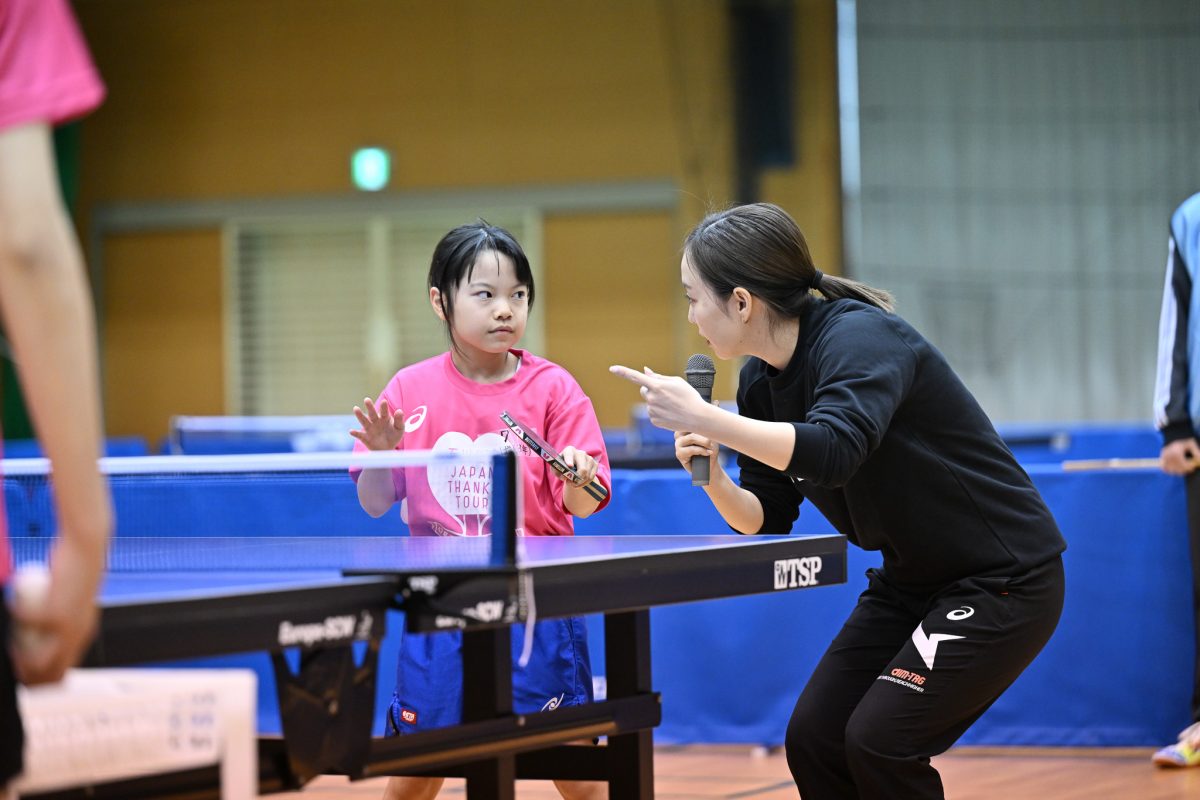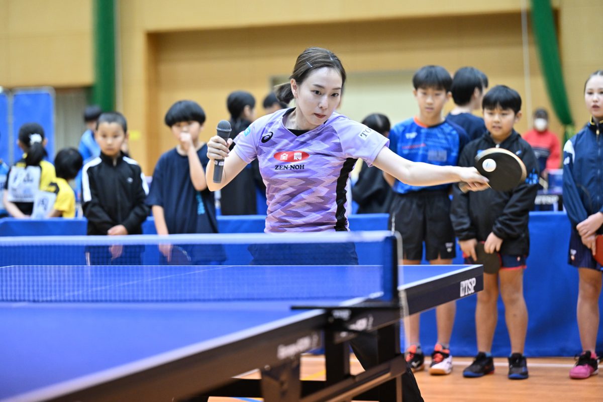 卓球技術講習教室で石川佳純さんは、自身が現役時代に練習していた練習や下回転打ちを披露。「1回打ったら、足をステップさせる。足に根っこが生えないように」「フォロースルーを意識する」など、参加者の目線に寄り添ったアドバイスを送った。