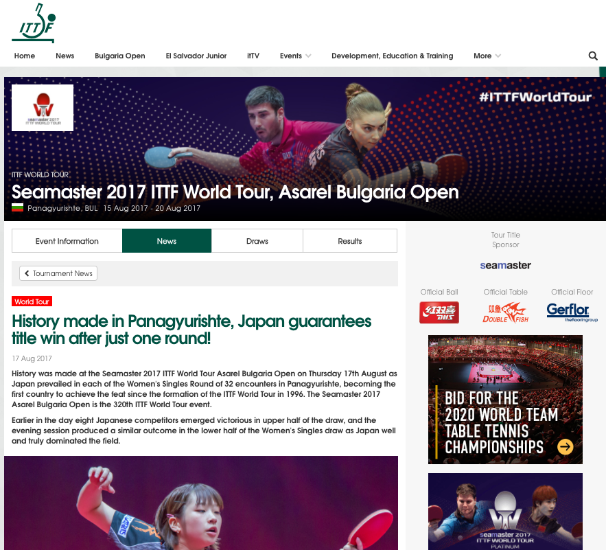 8月17日(木)Seamaster2017 ITTFワールドツアー・ブルガリアオープンで歴史が作られた。女子シングルスのベスト32ラウンドの各試合で日本選手が勝ち、1996年にITTFワールド・ツアーが始まって以来の偉業を成し遂げた。2017ブルガリアオープンはITTFワールドツアーで320回目の大会となる。