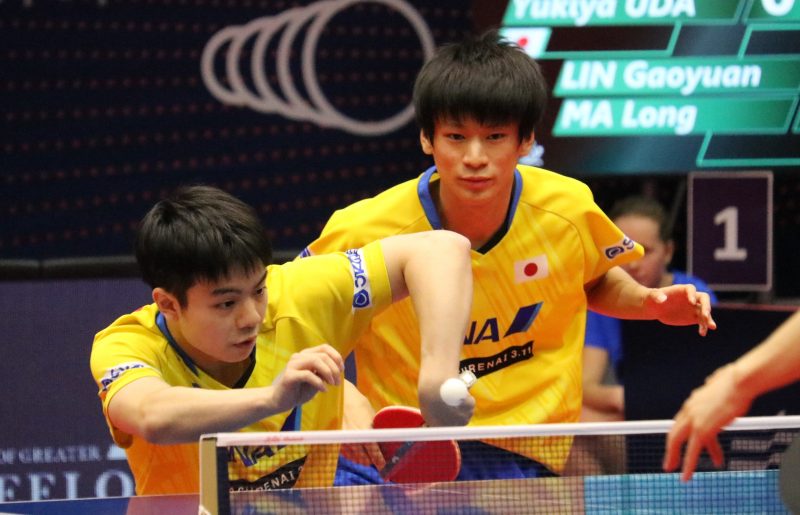 宇田・戸上の高校3年生の同級生コンビは、中国の馬龍(マロン・同5位)/林高遠(リンガオユエン・同2位)ペアと対戦。日本の若手ペアは、中国ペア相手にもまったく物怖じせず、第1ゲームを先取する。