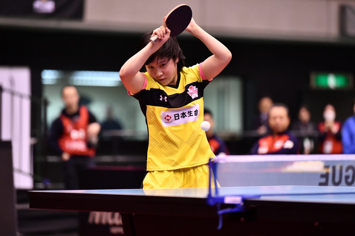 ダブルス10戦7勝と高勝率を誇る日本生命の常/蒋ペアに対し、意表をついた急造ペアで臨んだ日ペM。松平のしゃがみ込みサーブと、相馬のカットという「変化」が最大の武器の松平/相馬ペアだったが、常と蒋の対応力の高さが際立った。日本生命ペアは、松平と相馬の回転量の多いサーブを丁寧に返球し、相馬のカットを狙い打つという戦術を徹底し、2ゲームとも11-5という圧巻の強さを見せた。